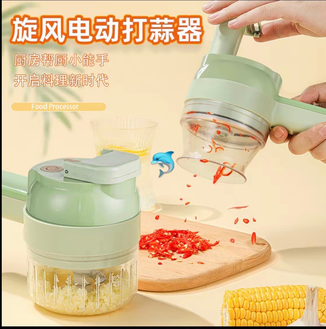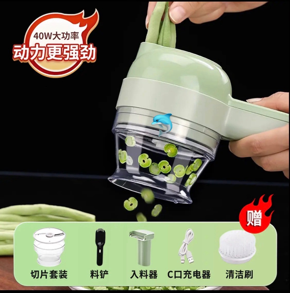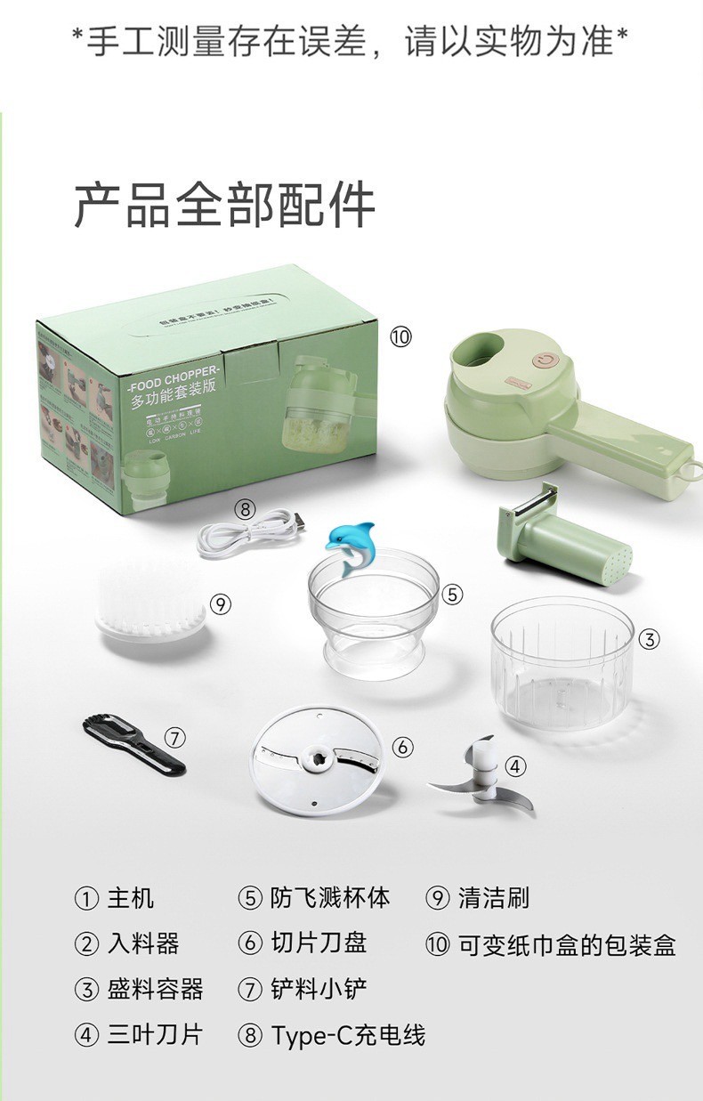 尺寸:20.5-9.5-8cm 颜色:绿色 电源:USB充电 功能:切蒜蓉配菜料等,洗碗,电刷洗碗等,削皮刀等