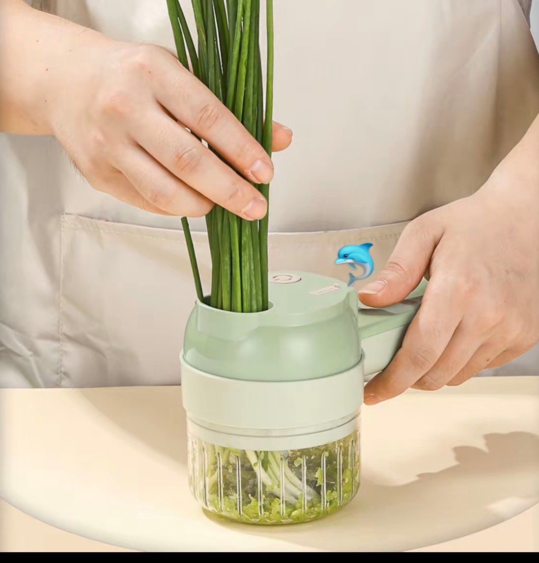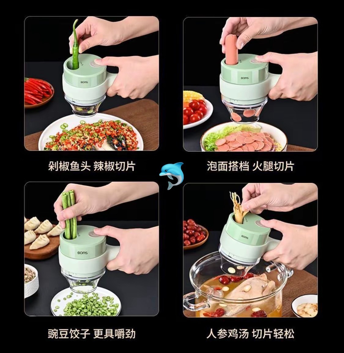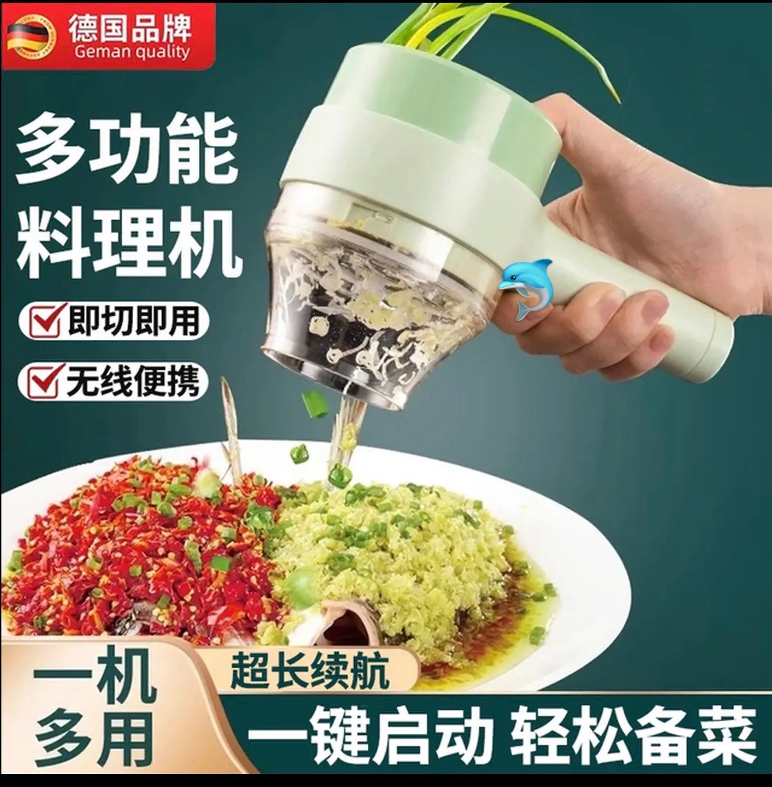 尺寸:20.5-9.5-8cm 颜色:绿色 电源:USB充电 功能:切蒜蓉配菜料等,洗碗,电刷洗碗等,削皮刀等
