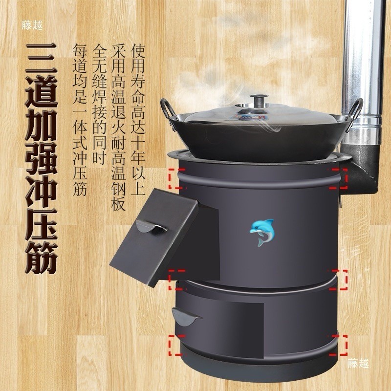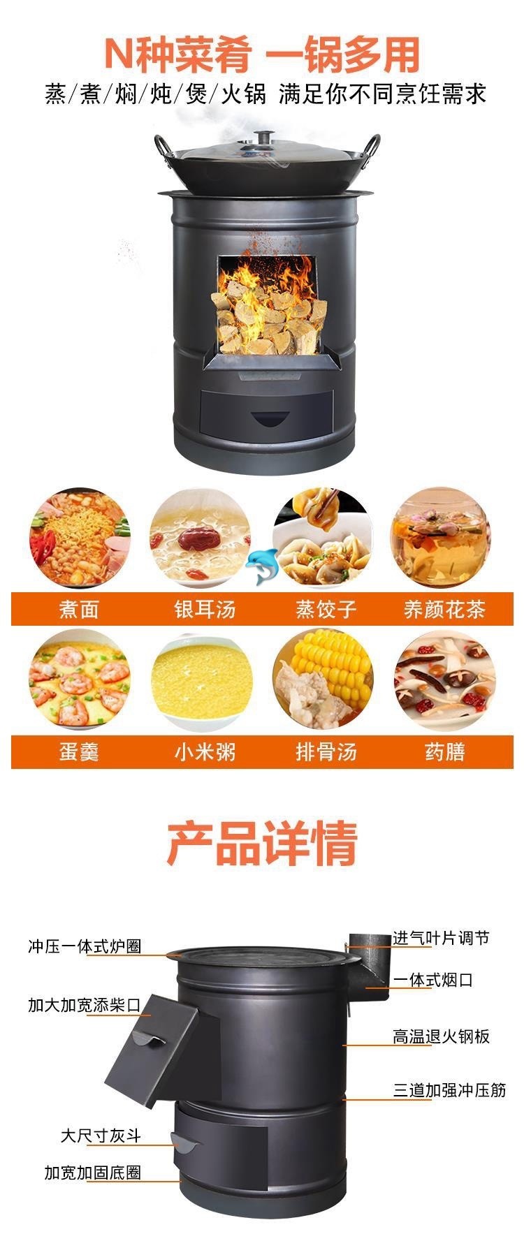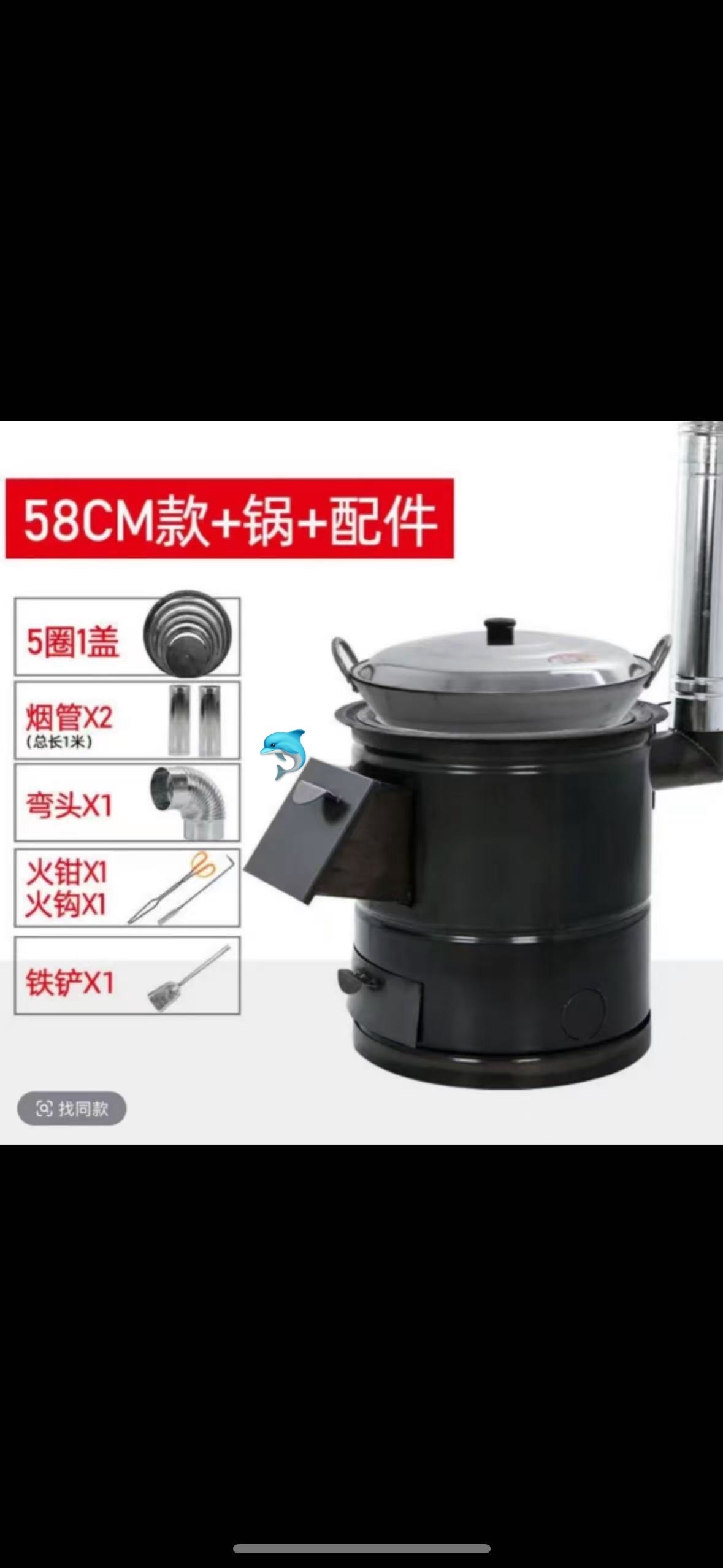 柴火炉尺寸:外径58,内径50cm、深度48,高度50cm 产品材质:铁 产品配置:带锅款(55cm) 配置:5圈1盖,烟管*2(总长1米),弯头1个,火钳1,火钩1,铁铲1