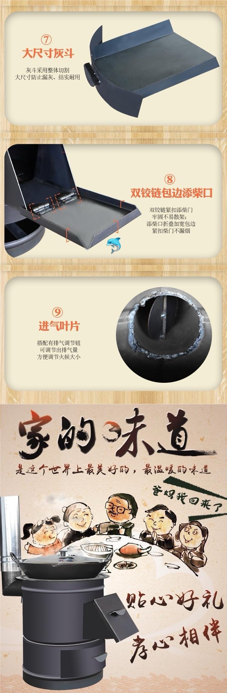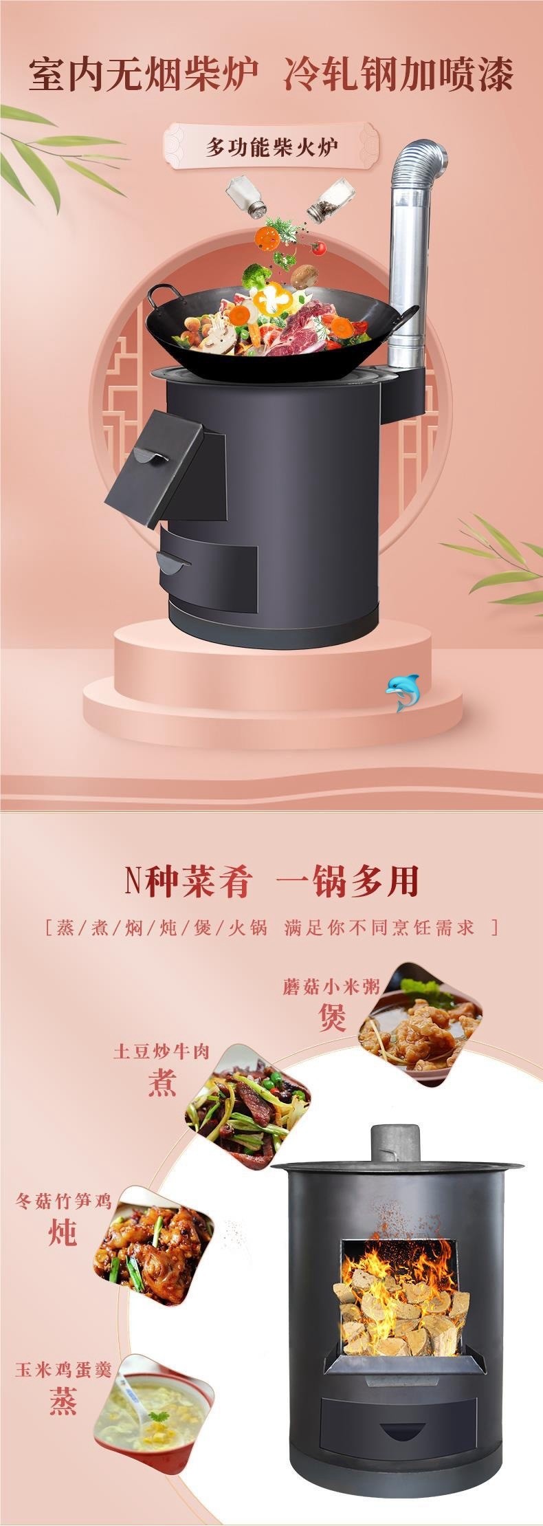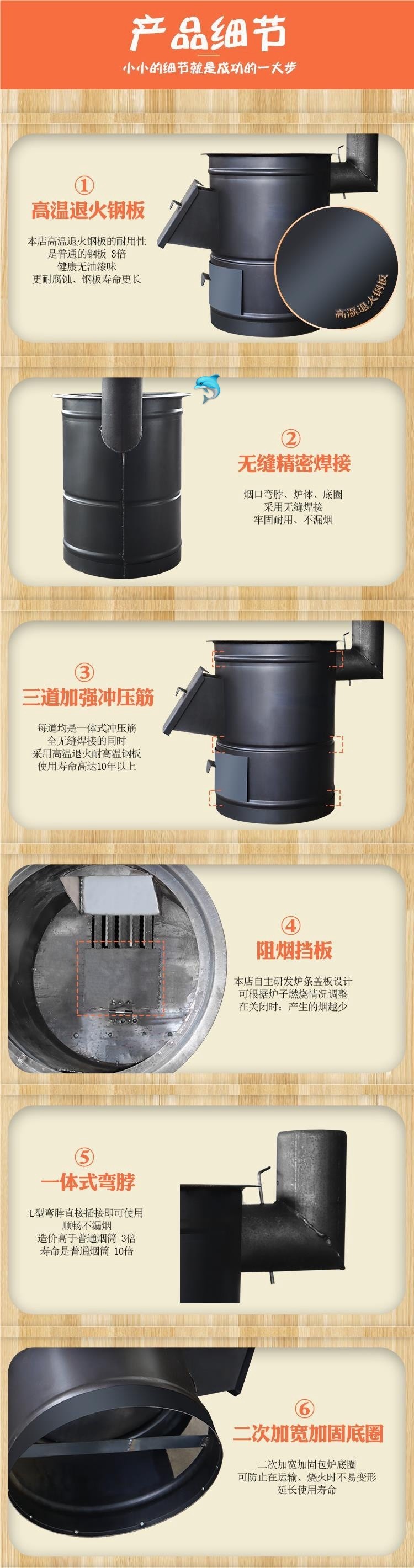 柴火炉尺寸:外径58,内径50cm、深度48,高度50cm 产品材质:铁 产品配置:带锅款(55cm) 配置:5圈1盖,烟管*2(总长1米),弯头1个,火钳1,火钩1,铁铲1