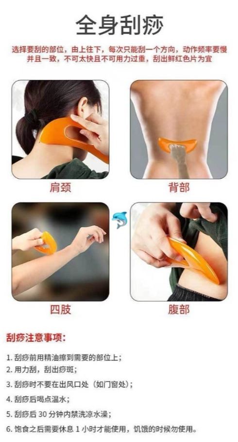⚠️刮痧注意事项: 1.刮痧前用精油擦到需要的部位上 2.用力刮,刮出痧斑; 3.刮痧时不要在出风口处(如门窗处 4.刮痧后喝点温水; 5.刮痧后30分钟内禁洗凉水澡; 6.饱食之后需要休息1小时才能使用,饥饿的时候勿使用。