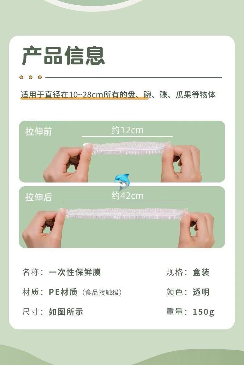 盒装:保鲜膜100支 重量:一盒重量120克左右 适用对象:适用于直径在10到28厘米,所有的盘,碗,碟,瓜果等物体 微信 smart-link888 电话 (437)-231-9888 可配送请按以上两方式联系!!