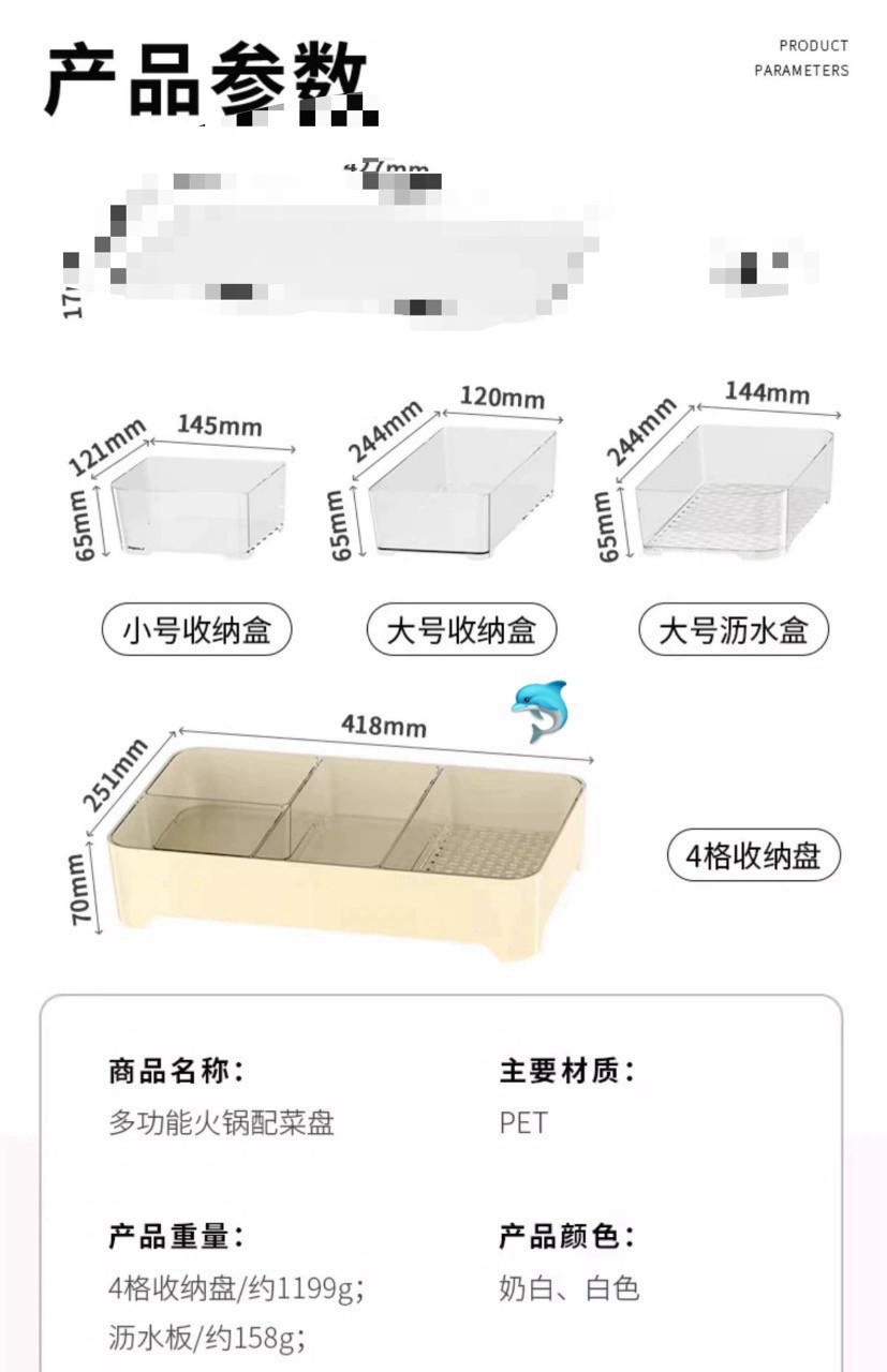 产品材质:PET 产品尺寸:41.8×21.5×7cm 产品颜色:白色 产品款式:四分格无盖款